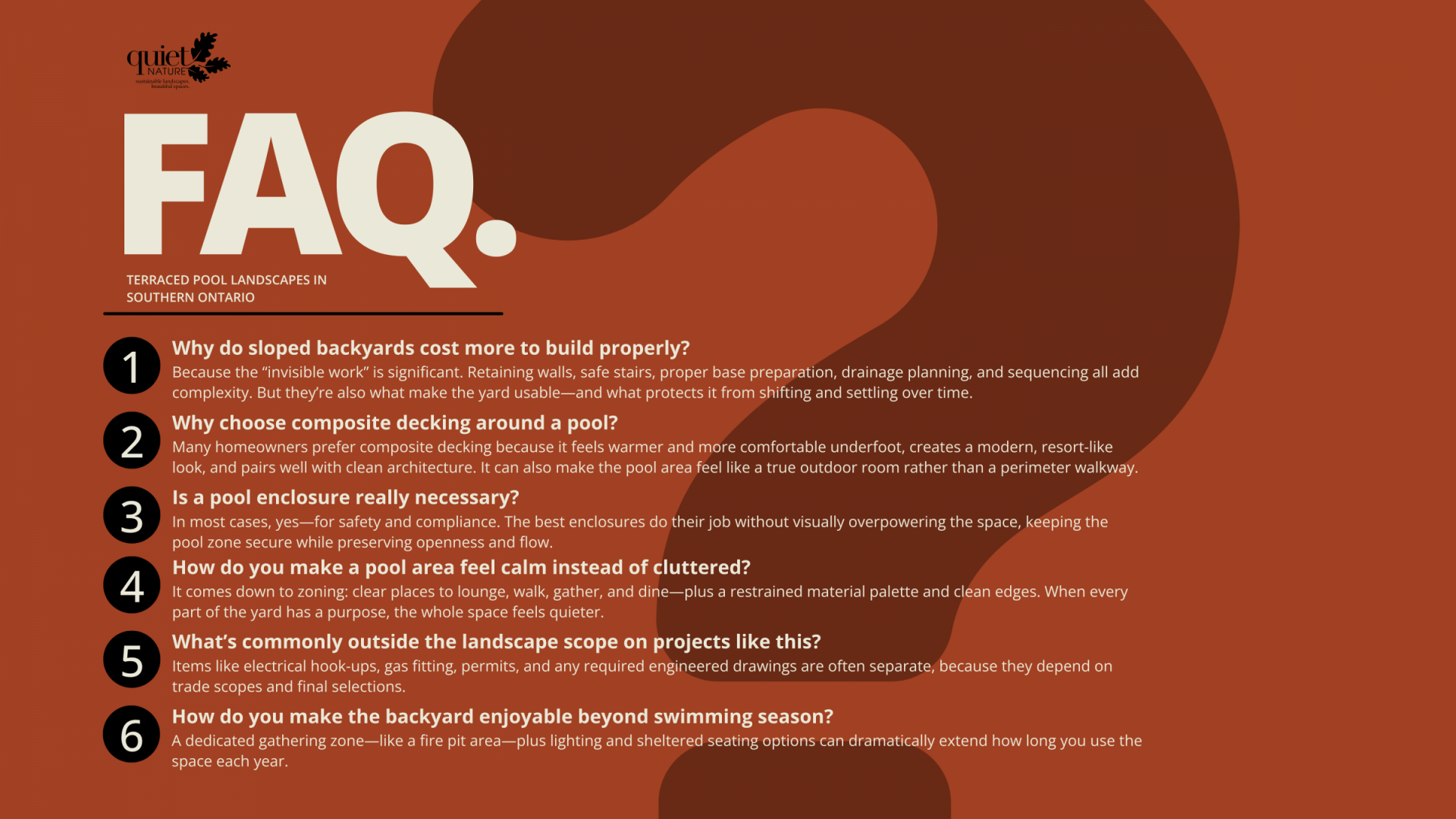 For a river-adjacent, terraced pool landscape in the Waterloo Region / southern Ontario—including patio spaces, composite pool terrace, pool enclosure, retaining walls with stairs/landings to a lower meadow, planting, and landscape lighting—a realistic current investment range is: