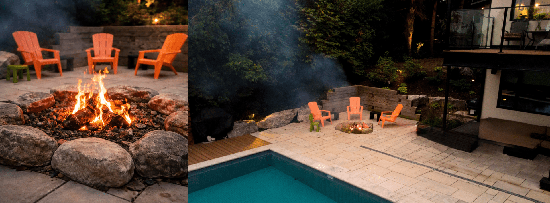 A lot of pool backyards get used heavily in July… and then the evenings arrive, and there’s nowhere to gather. This project intentionally included a