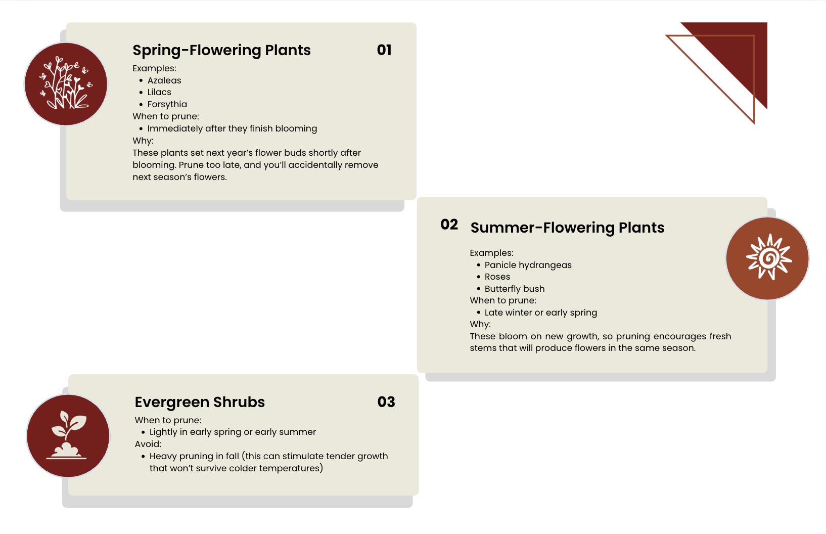 • Late Winter / Early Spring: Structural pruning, grasses, summer bloomers